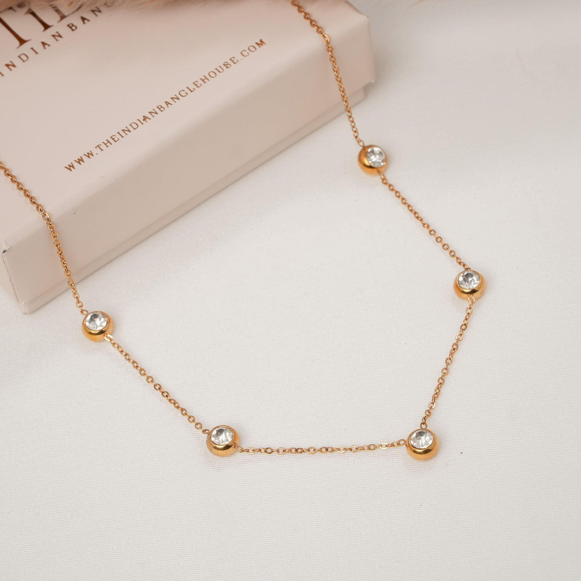 This 5 Stone Necklace offers the best of both worlds - luxurious finish and affordable pricing. Made of stainless steel and 18k gold plating, it is waterproof and hypoallergenic for long lasting quality. Perfect for adding a touch of elegance to any outfit.