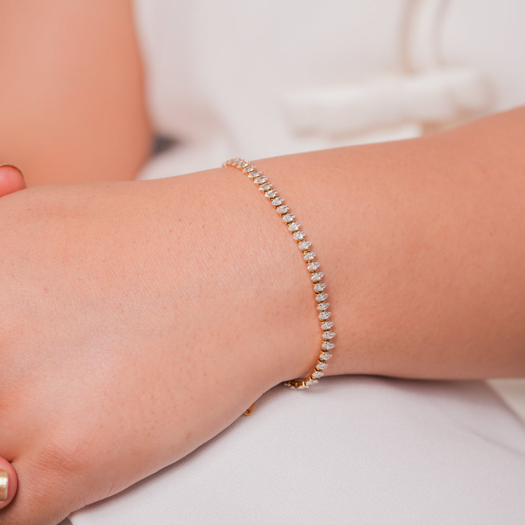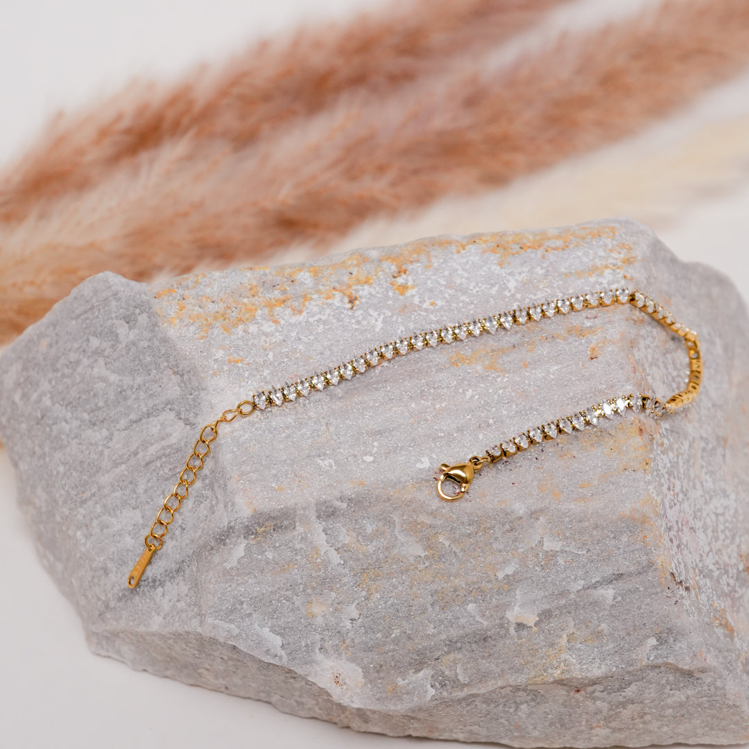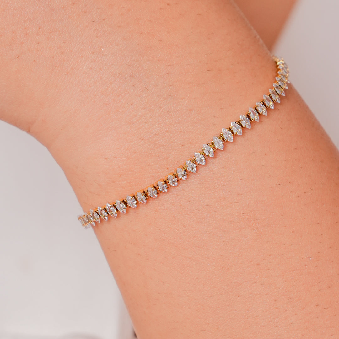 Gleaming with sophistication, this 18K gold-plated bracelet showcases a graceful cz stones-inspired curved design on premium 316L stainless steel. Perfect for sensitive skin, its hypoallergenic properties ensure comfortable all-day wear. The waterproof and anti-tarnish finish maintains its radiant