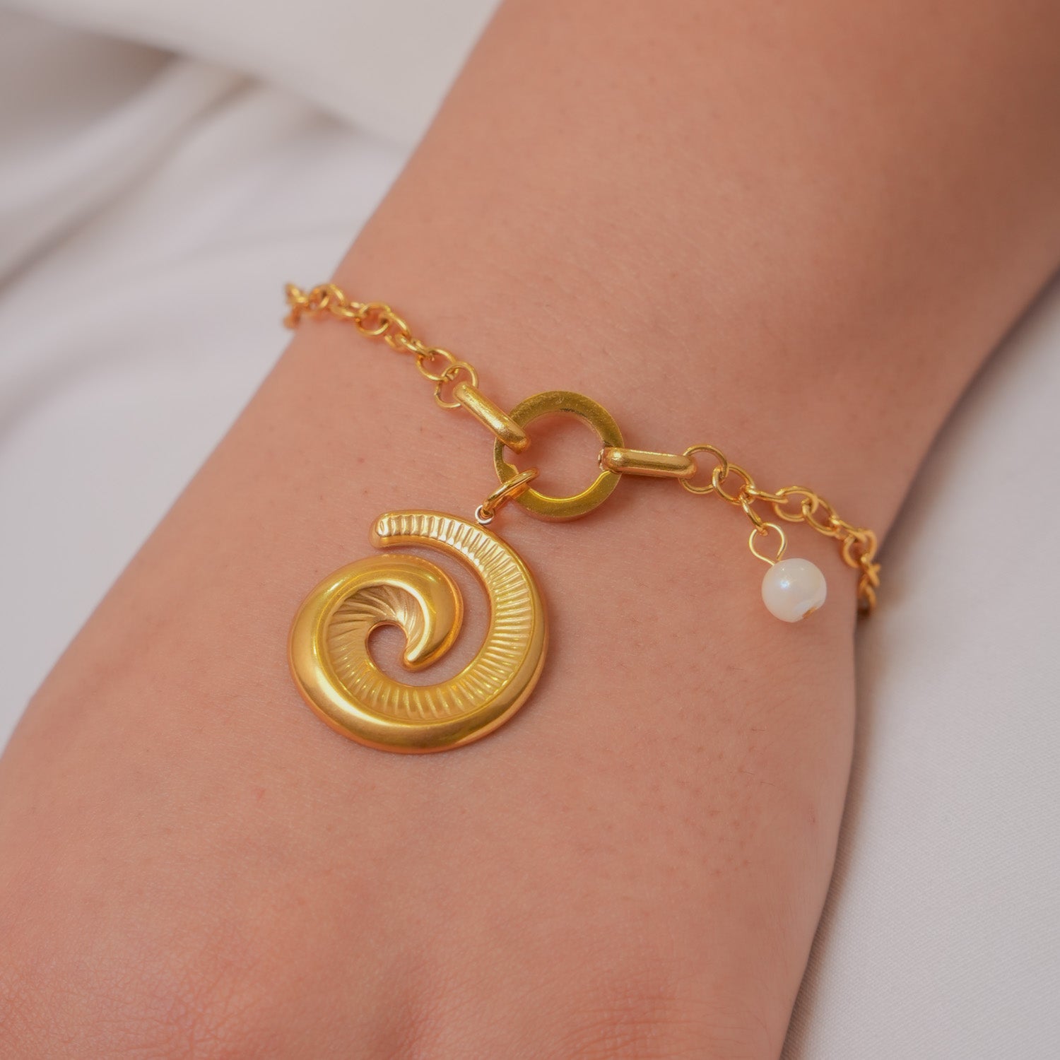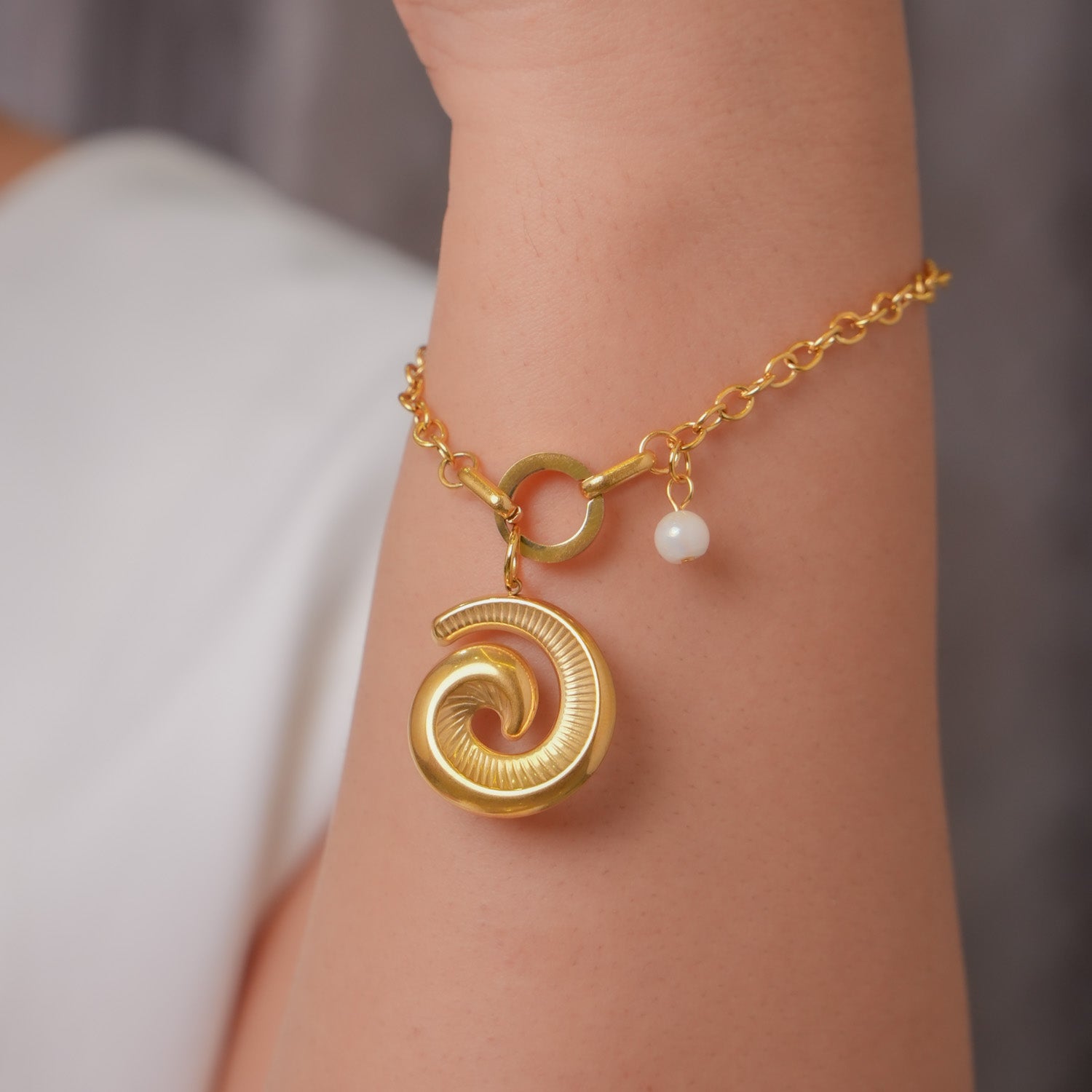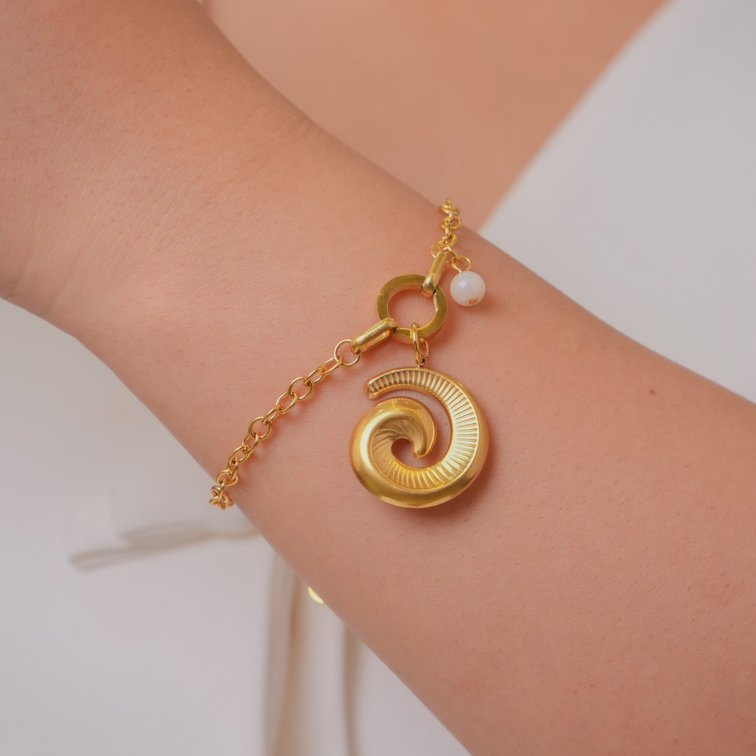 Shell Curve Luxe Bracelet features exquisite 18K gold plating on high-quality 316L stainless steel. This hypoallergenic piece boasts waterproof and anti-tarnish properties, ensuring lasting brilliance. Its elegant shell-inspired curved design combines sophisticated luxury with everyday wearability, making it ideal for sensitive skin while providing both comfort and enduring beauty.