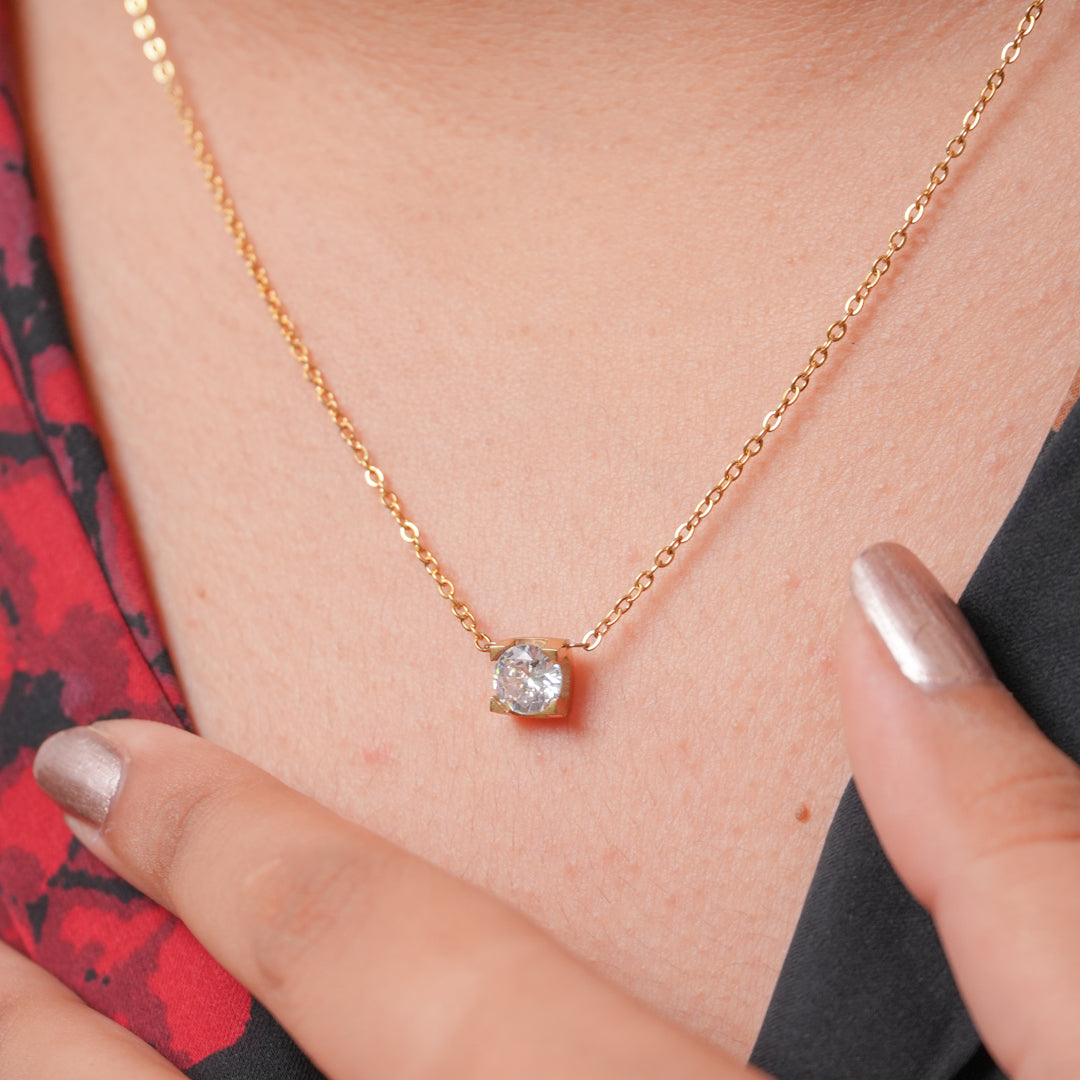 Refined elegance meets modern simplicity in the Classic Solitaire Box Pendant. Featuring a brilliantly cut cubic zirconia crystal securely cradled in a sleek, square gold-plated frame, this necklace radiates timeless charm. The shimmering stone catches the light from every angle, making it a perfect statement for both everyday chic and special moments. Crafted with a hypoallergenic, tarnish-resistant finish and a delicate yet durable chain, this piece is your go-to for understated luxury.