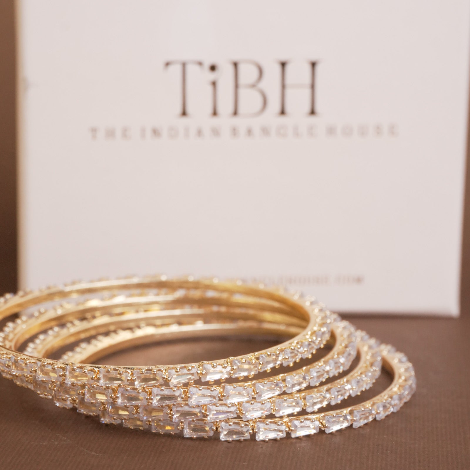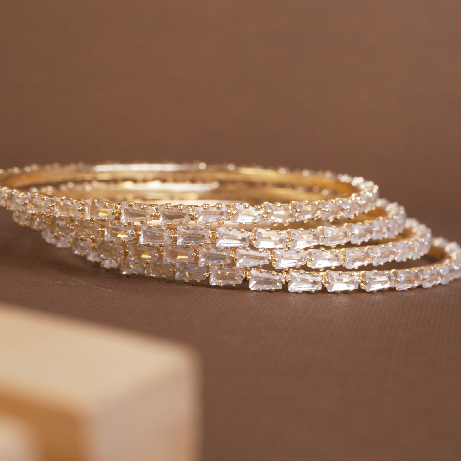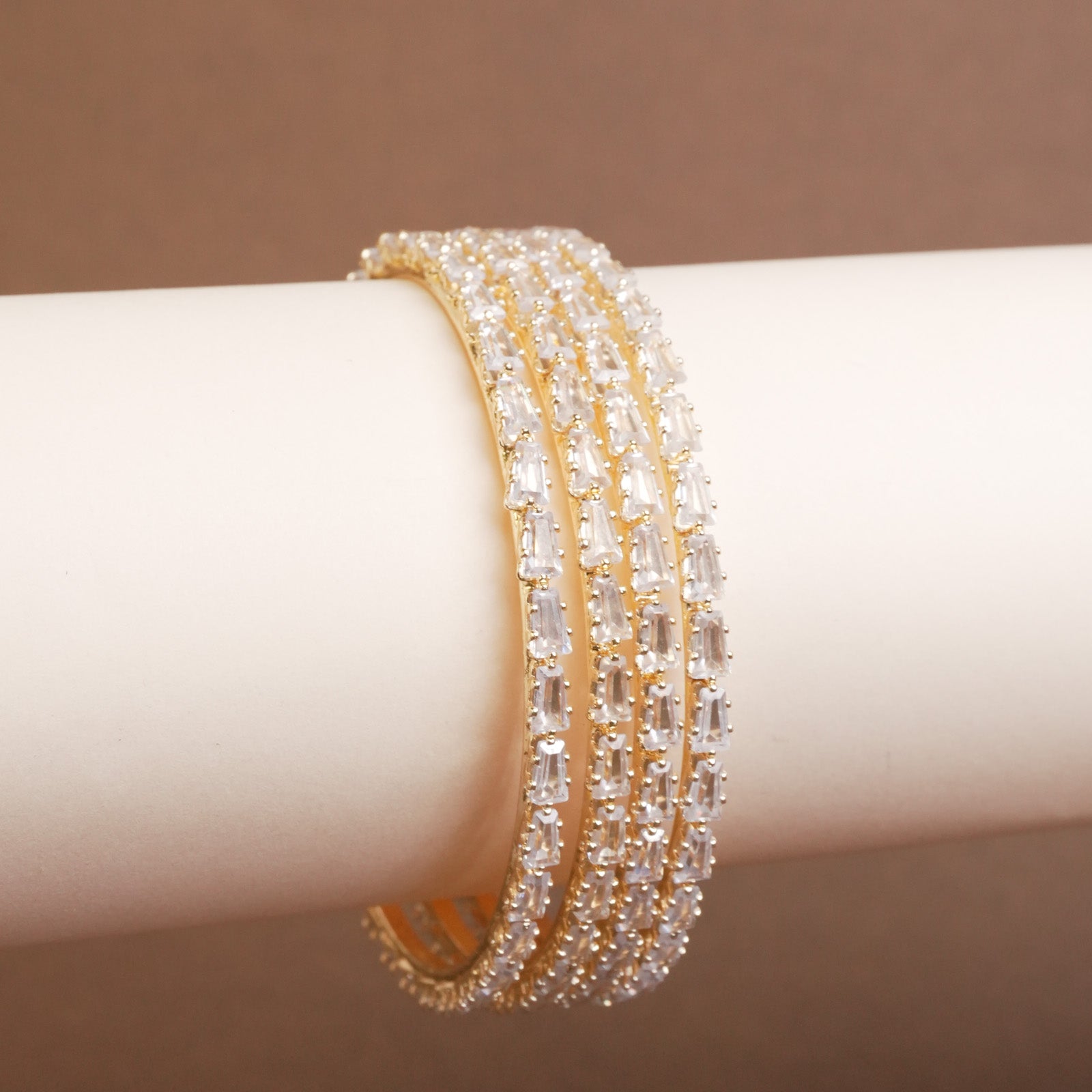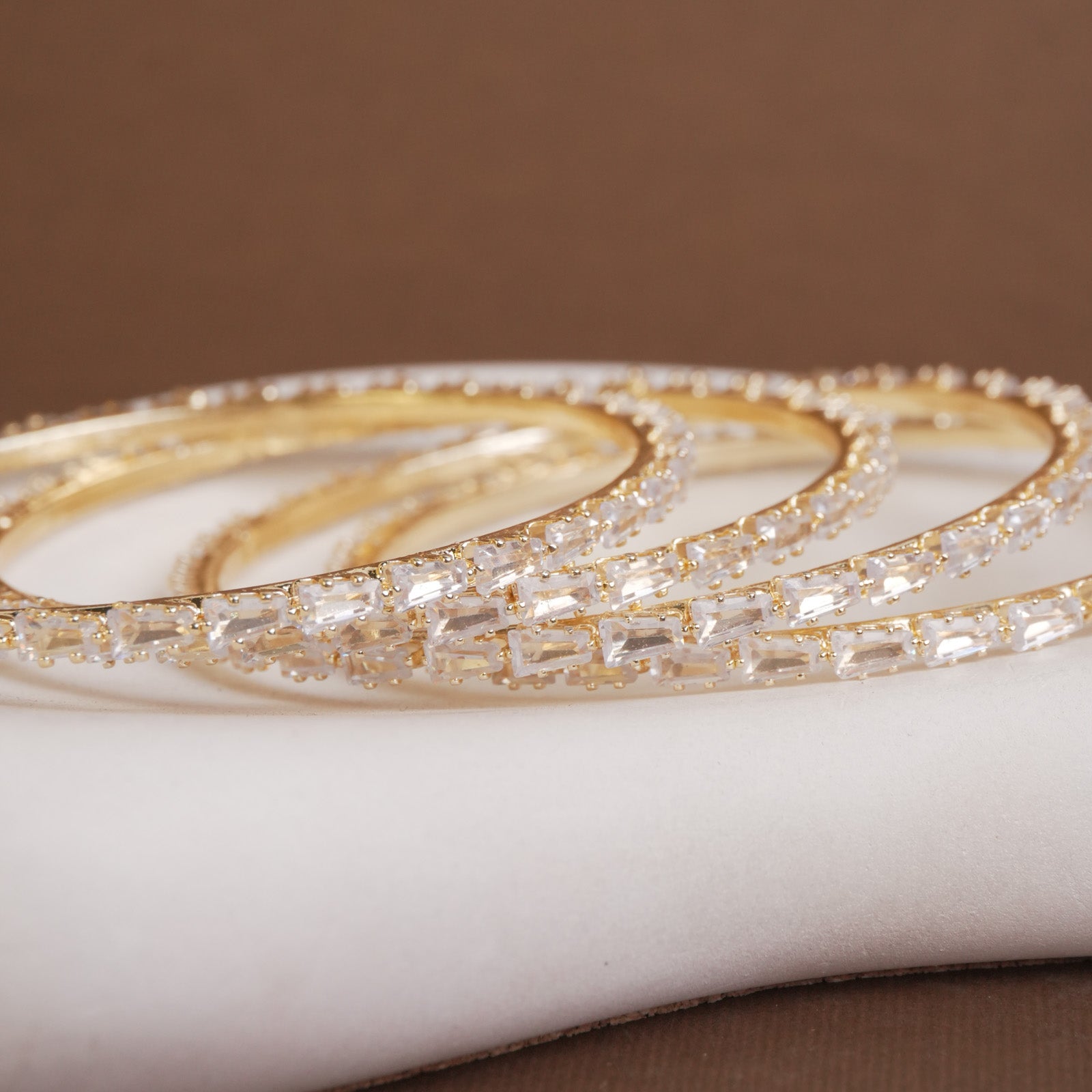 Add sparkle to your ensemble with these Cz Golden AD Bangles. Made of brass, these bangles feature intricate cz and diamond work and are anti-tarnish. Perfect for parties and traditional occasions, these bangles will elevate your ethnic look with elegance. (No more boring bangles!)
