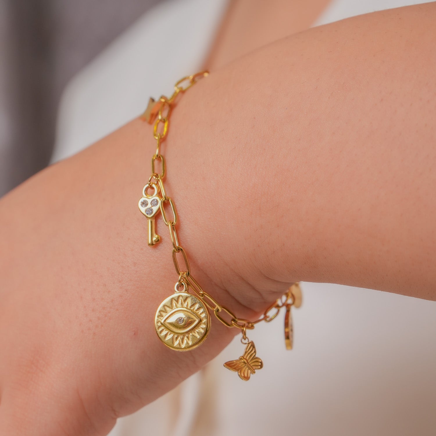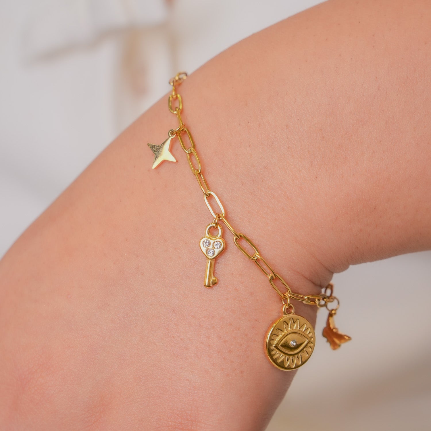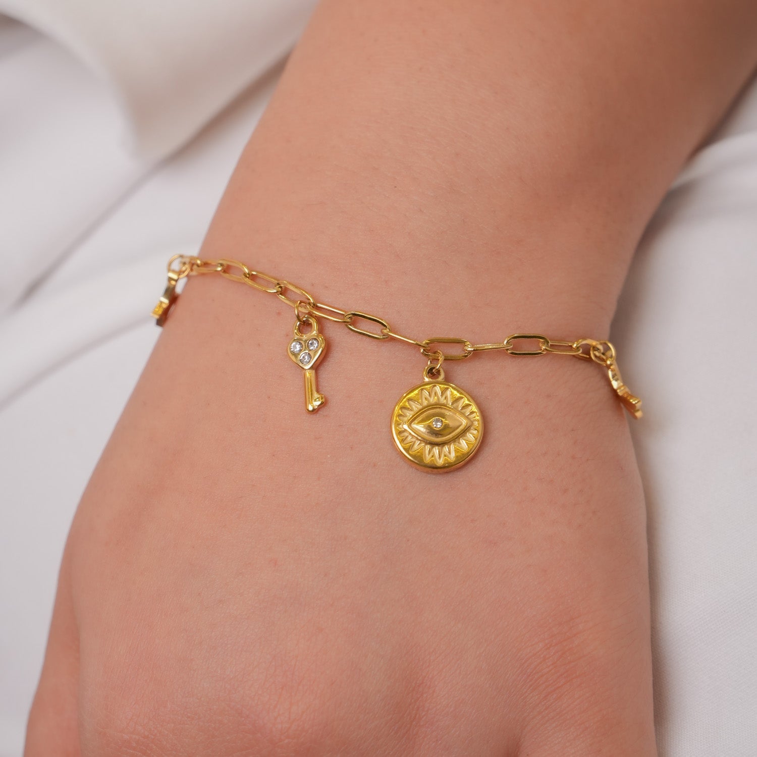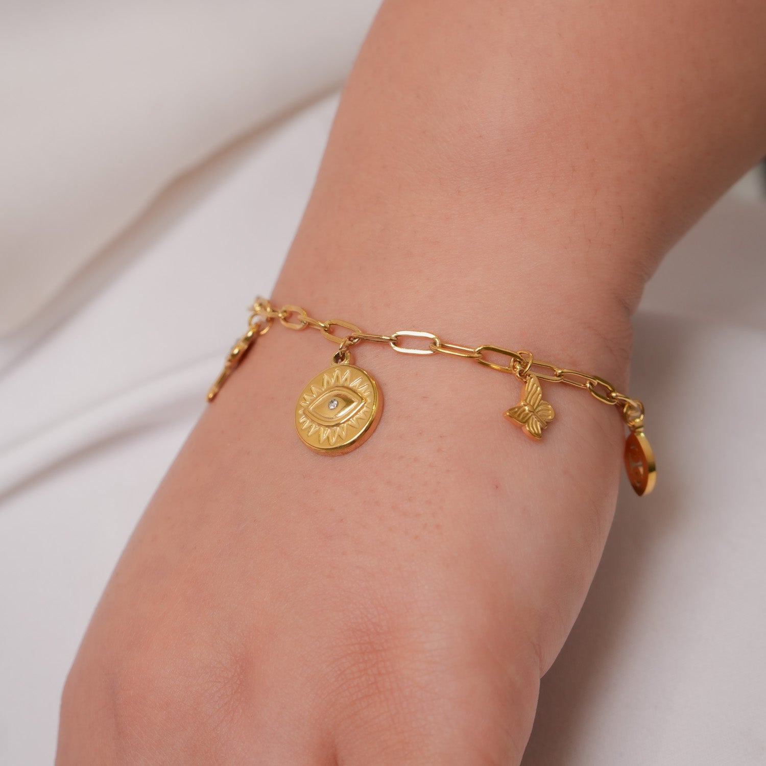 This stunning 18K gold-plated Evileye Orbit Bracelet combines elegance with protection, crafted from superior 316L stainless steel for lasting quality. Gentle on sensitive skin, its hypoallergenic composition provides exceptional comfort throughout your day. The bracelet's waterproof and anti-tarnish qualities preserve its luminous appearance, allowing you to enjoy its protective charm and sophisticated allure without worry about fading or discoloration.