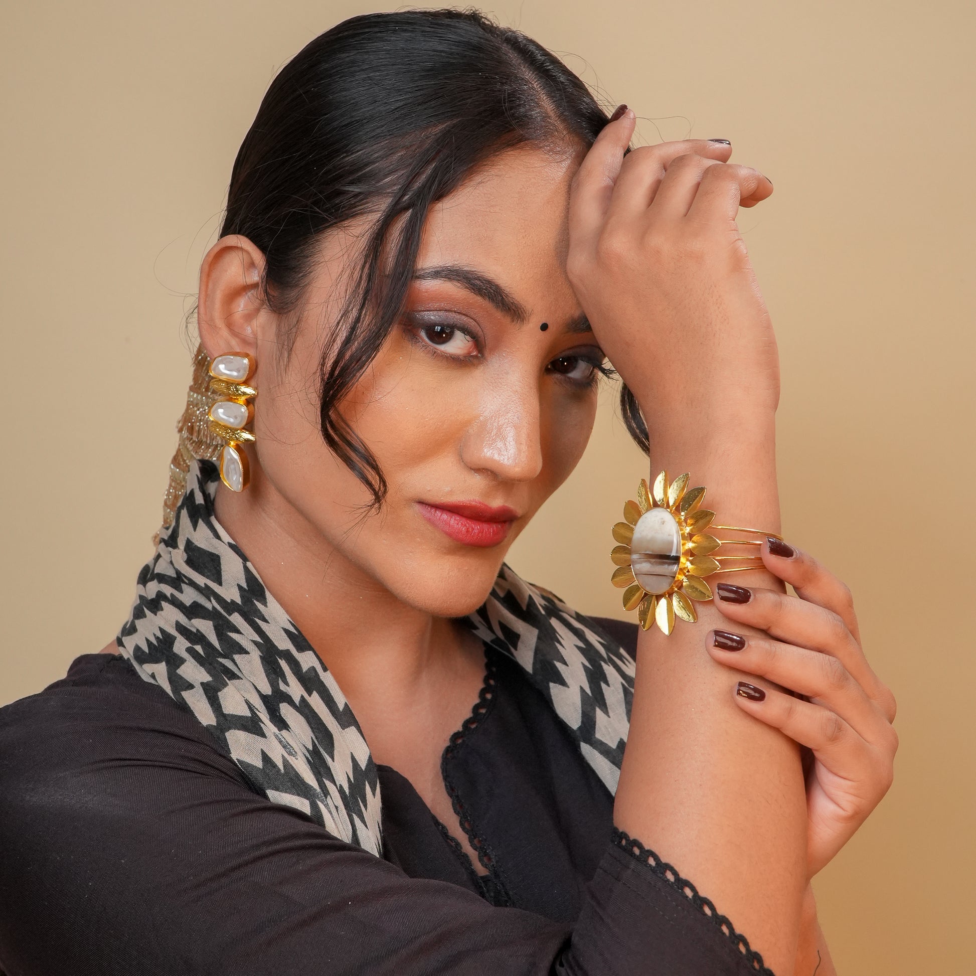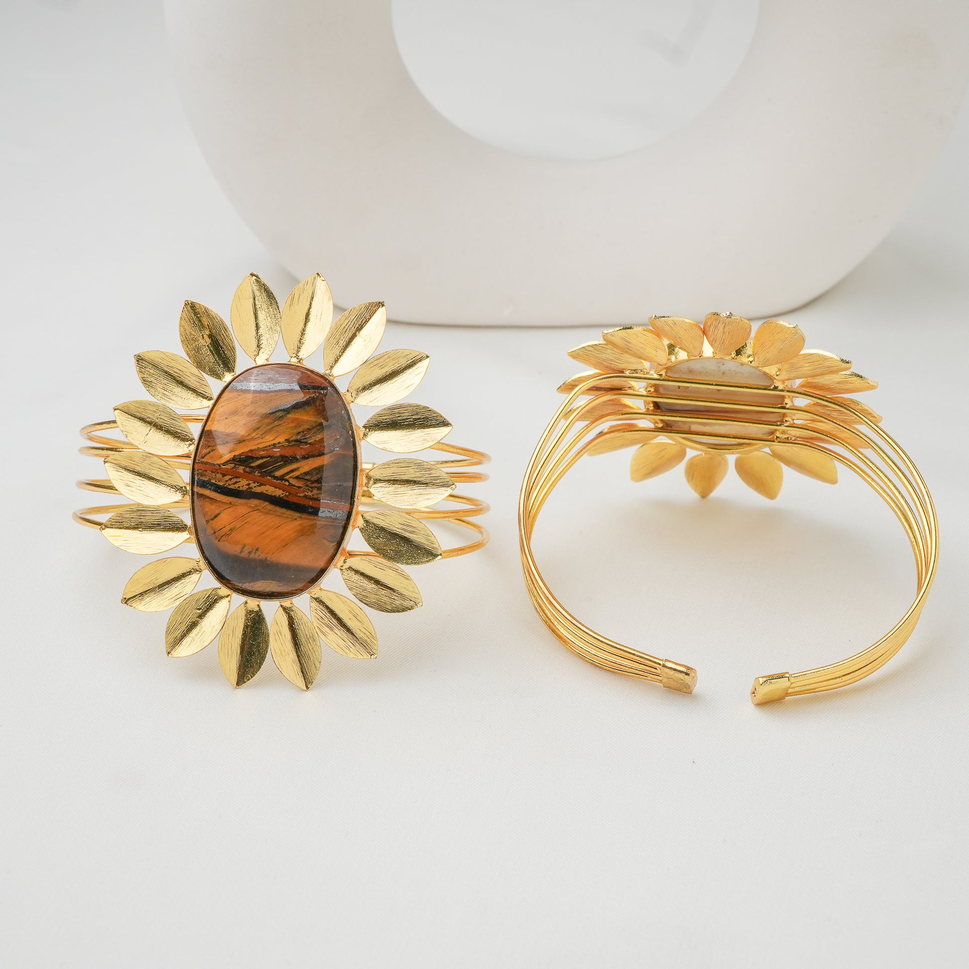 Radiate bold elegance with our handcrafted Sunburst Cuff Bracelet, featuring a striking oval stone centerpiece surrounded by gold-toned brass petals. Inspired by the brilliance of sunflowers, this open cuff design blends strength with femininity, making it the perfect statement piece for festive occasions or elevated everyday wear.