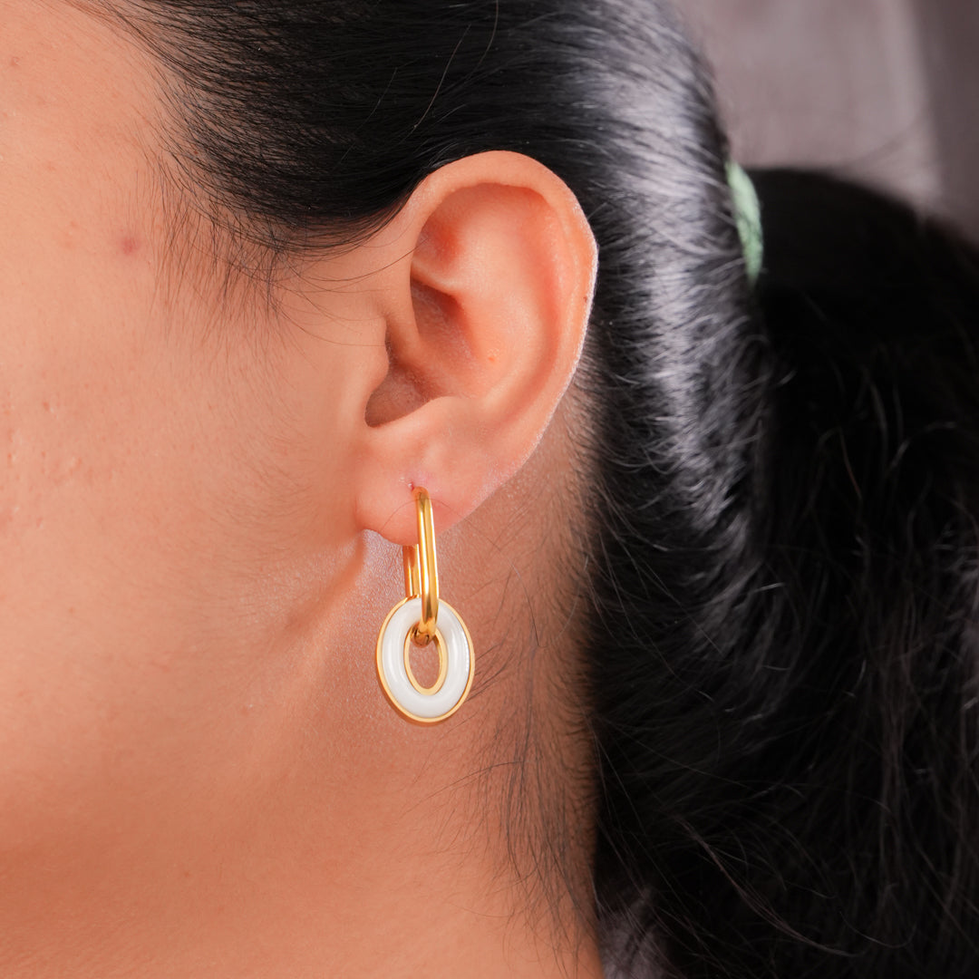 Minimalist with a modern twist, the Halo Drop Hoops feature glossy white enamel rings suspended from sleek gold-tone hoops. Light, airy, and effortlessly chic — they're the perfect accent to elevate both everyday and evening looks.