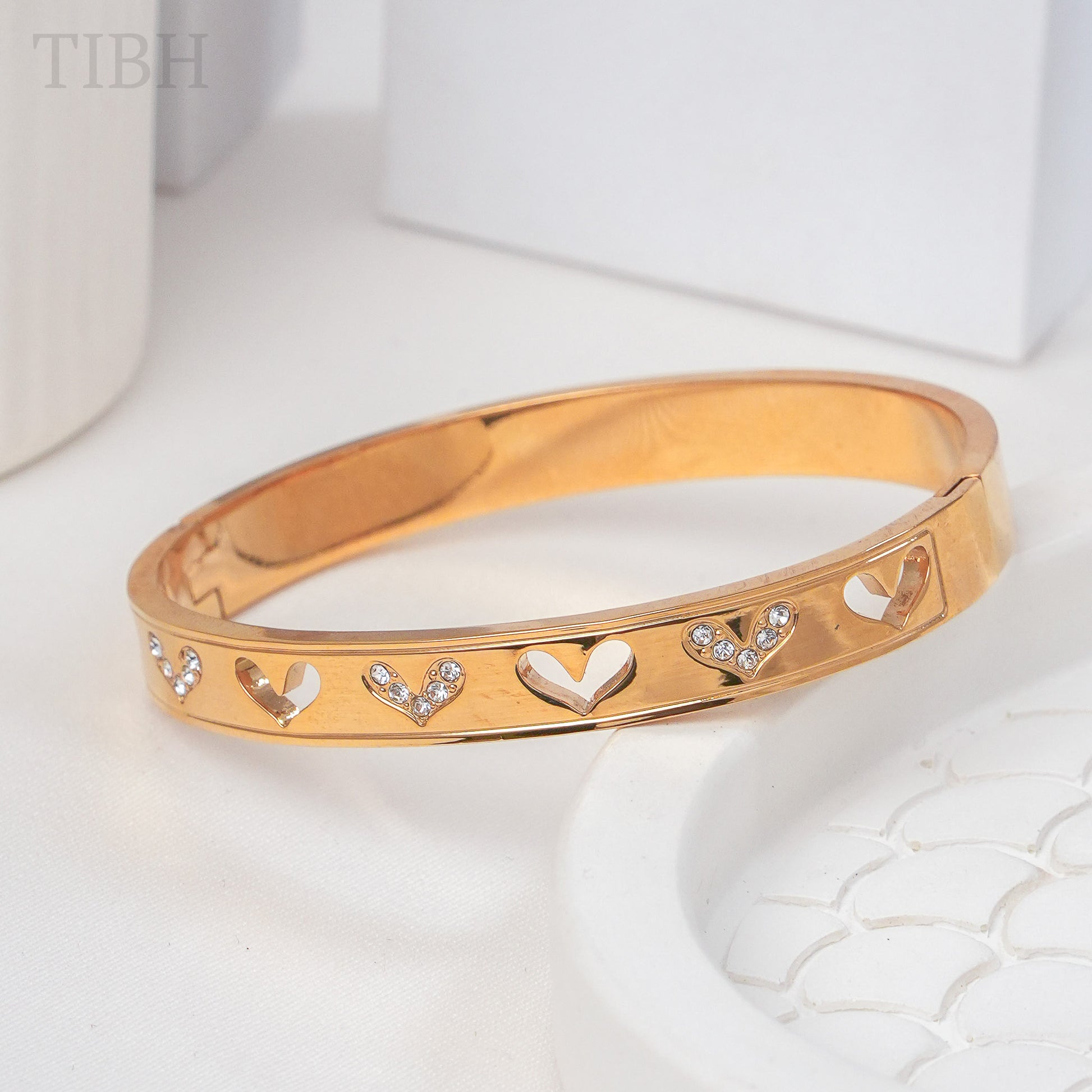 Add a touch of charm to your everyday look with this Heart Cut Cuff Bracelet. Crafted from durable stainless steel and finished with a radiant 18K gold plating, it offers lasting shine and water resistance for worry-free wear. Its hypoallergenic design ensures comfort for all-day use, while the playful heart cutout adds a sweet, flirty detail. Perfect for layering or wearing solo, this bracelet brings effortless elegance and a dash of fun to any outfit.