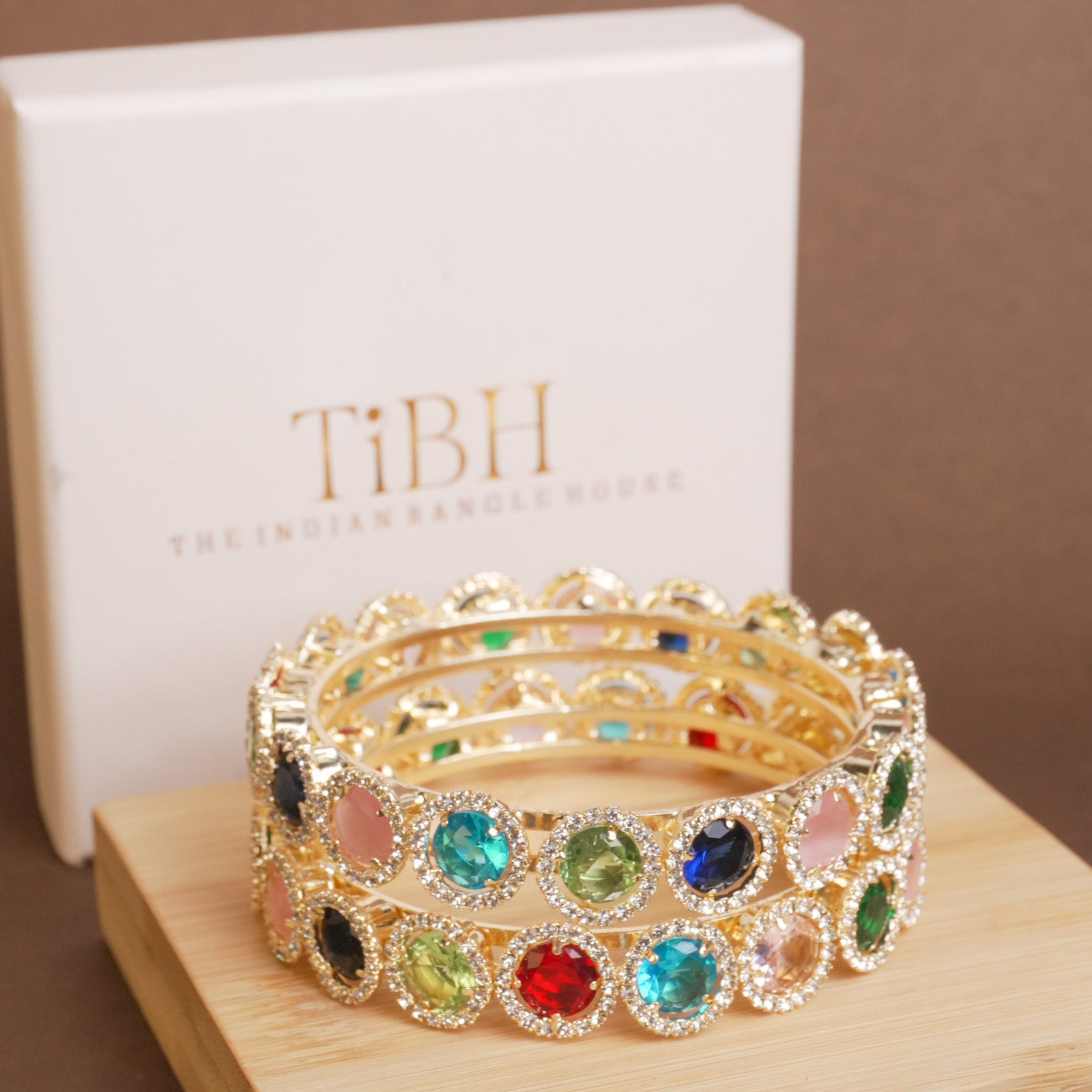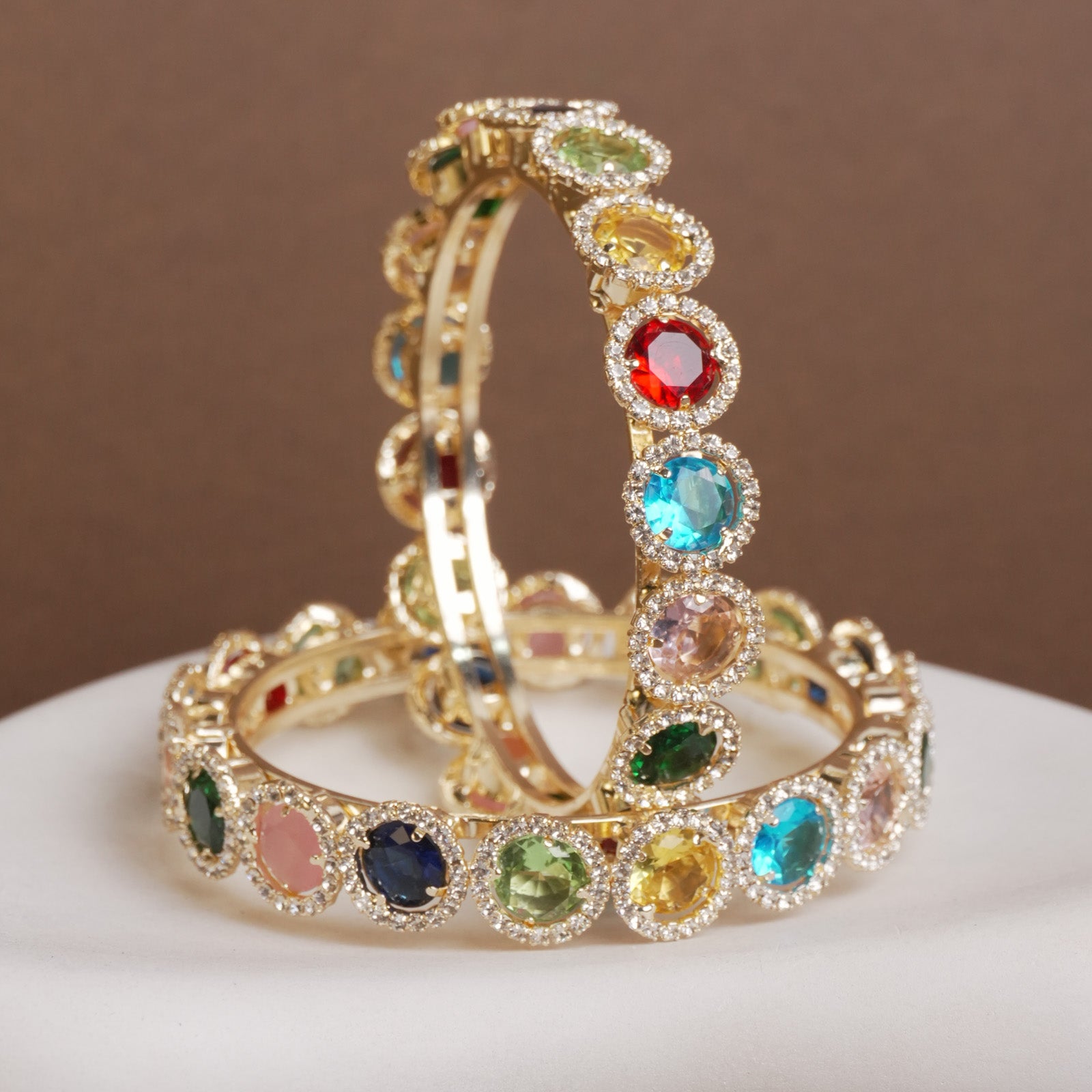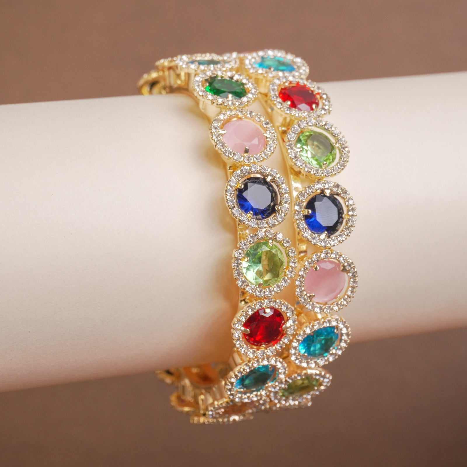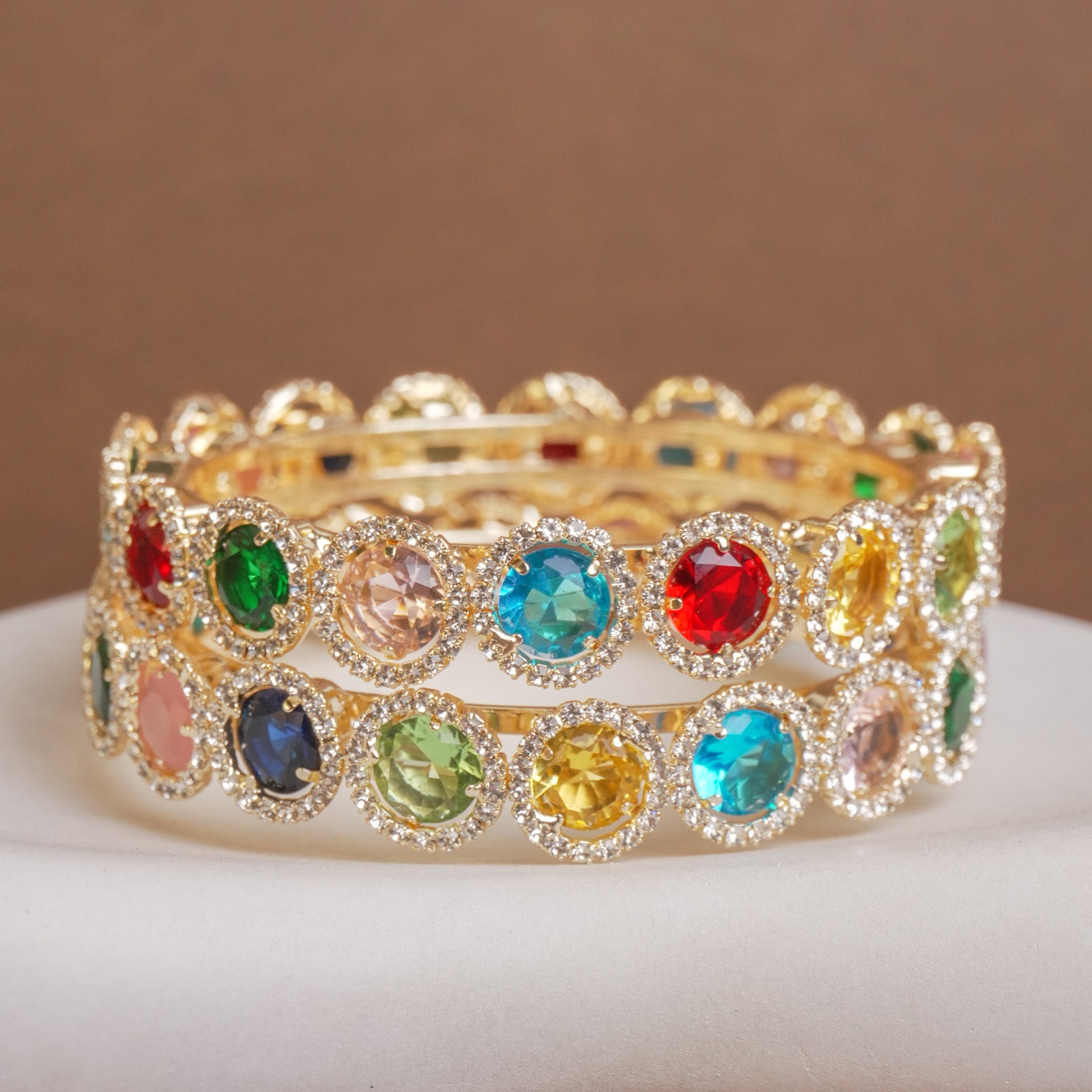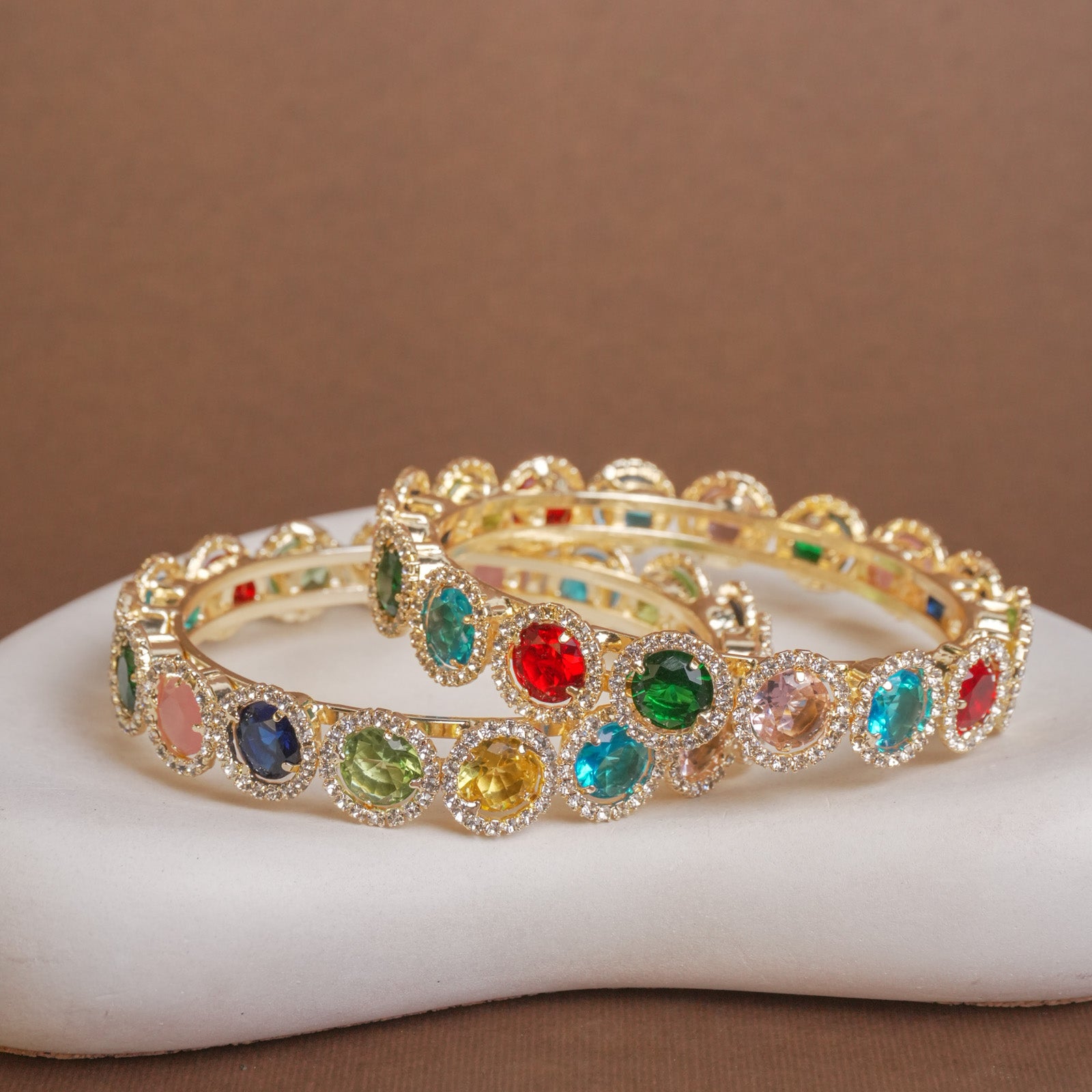Add a touch of elegance with our multicolor American diamond stone kada bangle pair. Handcrafted with precision, these bangles are a perfect accessory for any occasion. Embrace the beauty and versatility of these bangles and elevate your style effortlessly.