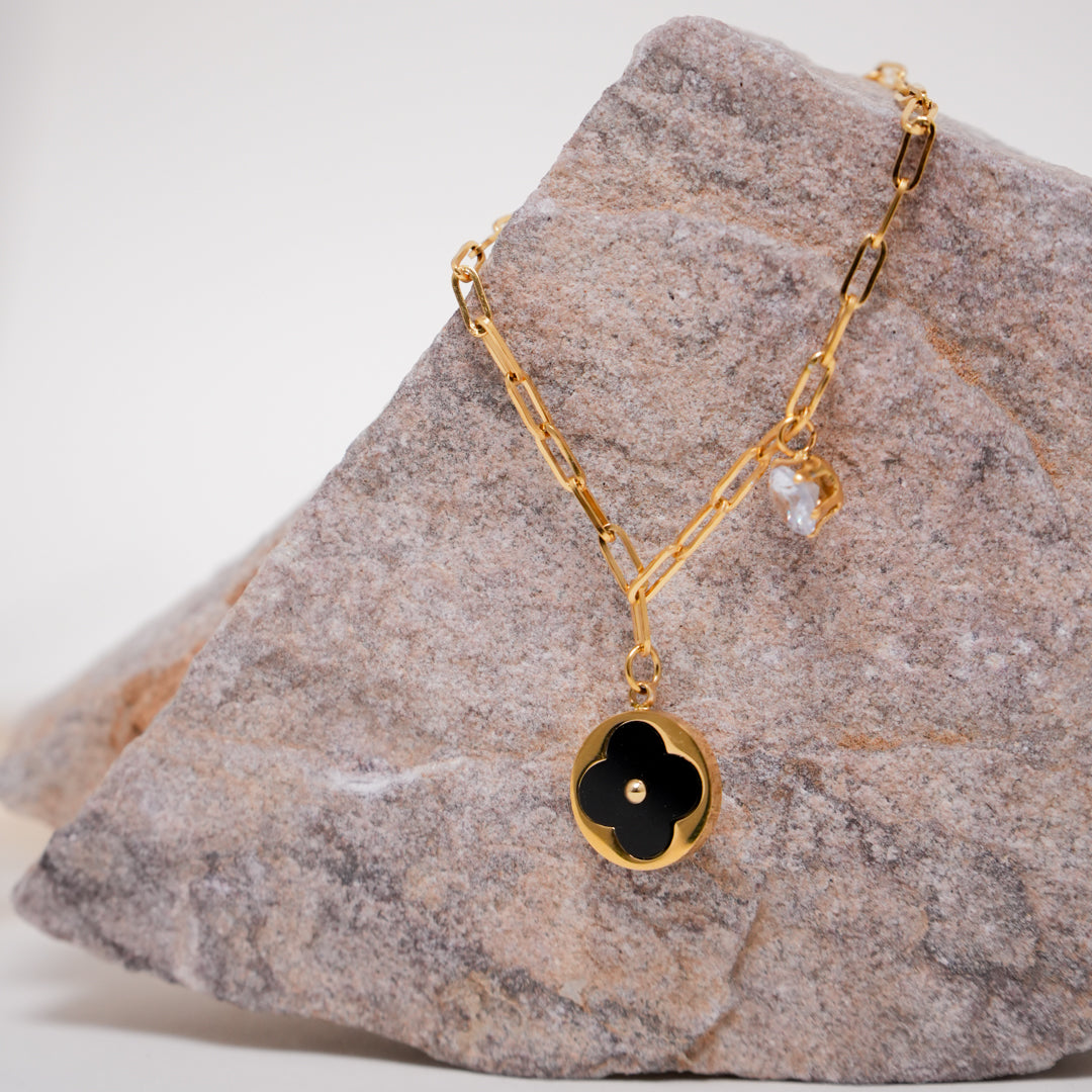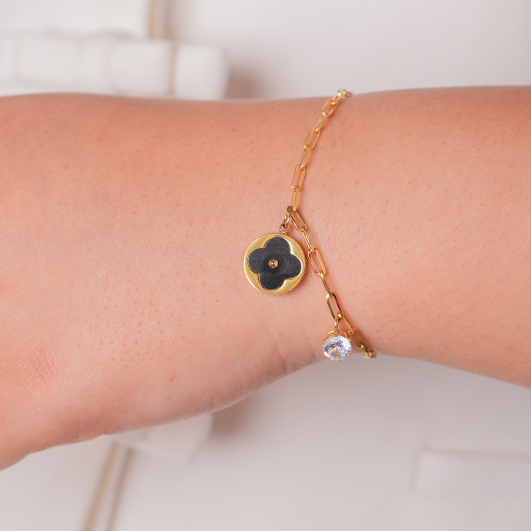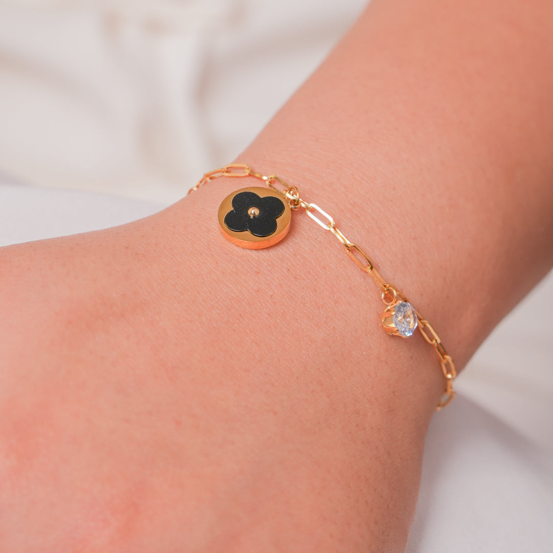 Elevate your everyday look with the Midnight Clover Charm Bracelet. Crafted on a dainty gold-plated paper-clip chain, it features a sleek black enamel clover disc and a single sparkling cubic-zirconia drop. The contrast of matte black and brilliant shine creates a modern yet playful vibe. Fully waterproof, anti-tarnish, and made from premium stainless steel, this lightweight bracelet is designed for fuss-free wear—day or night. Adjust the clasp for the perfect fit, wear it solo for a subtle statement, or stack it with your favorite pieces for a layered luxe finish.