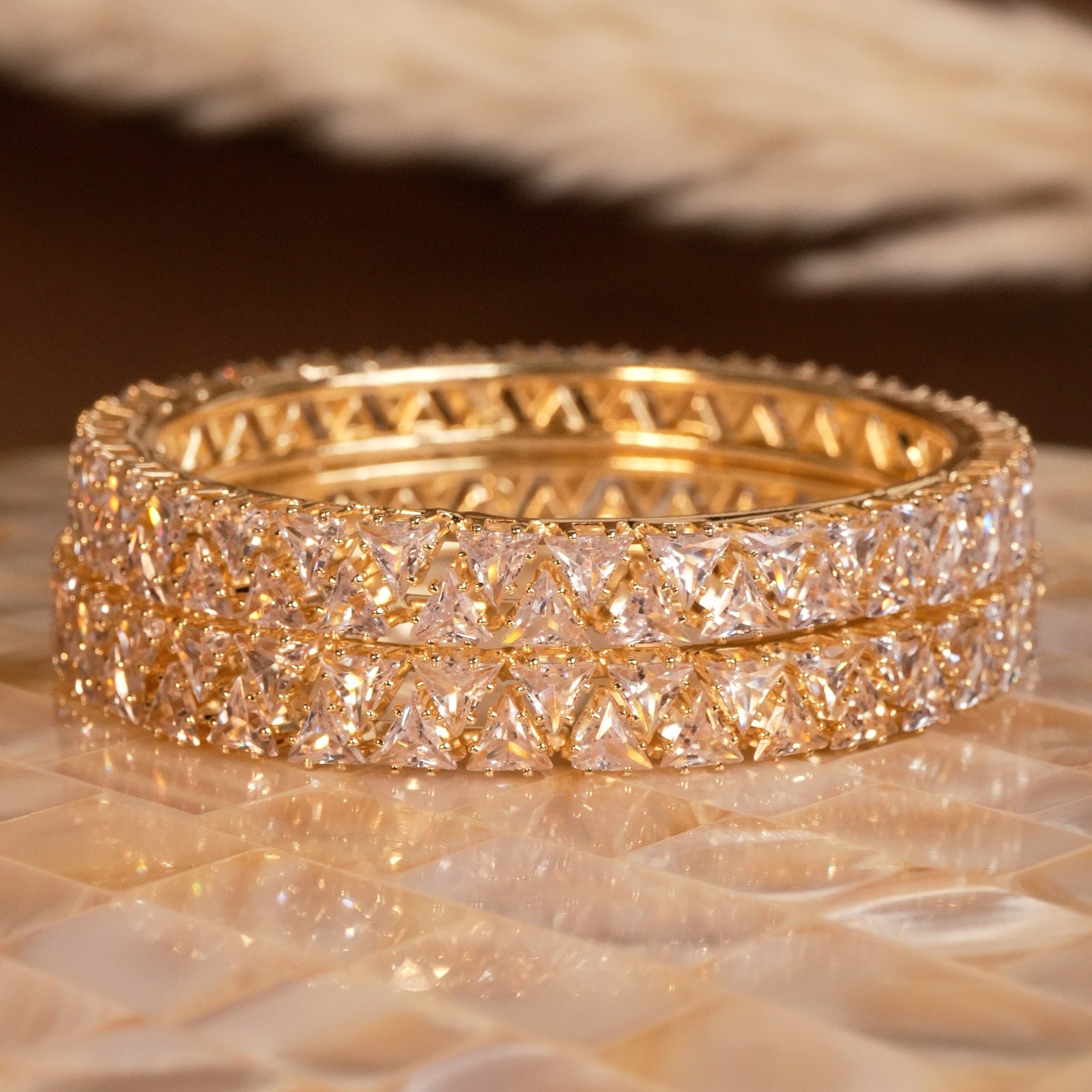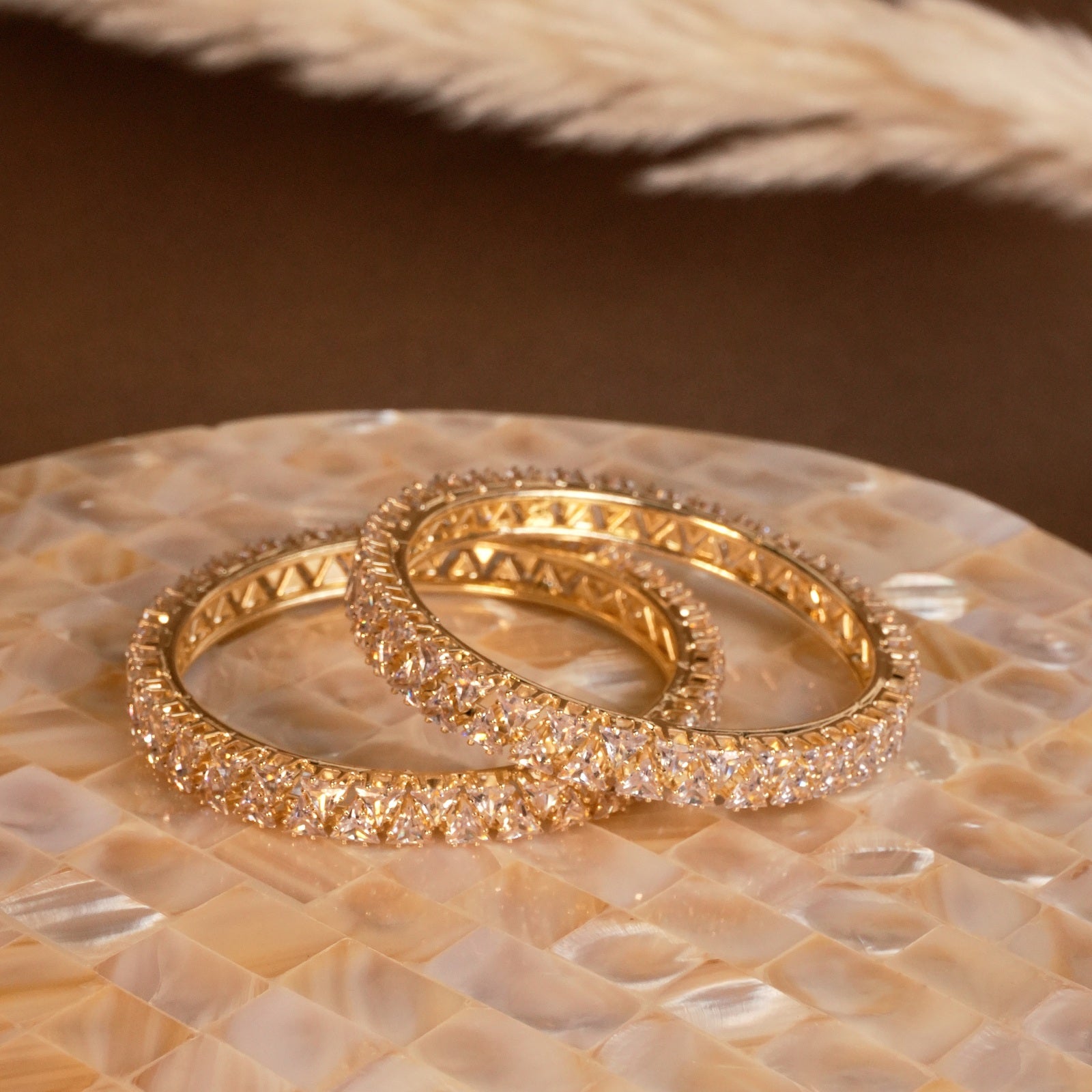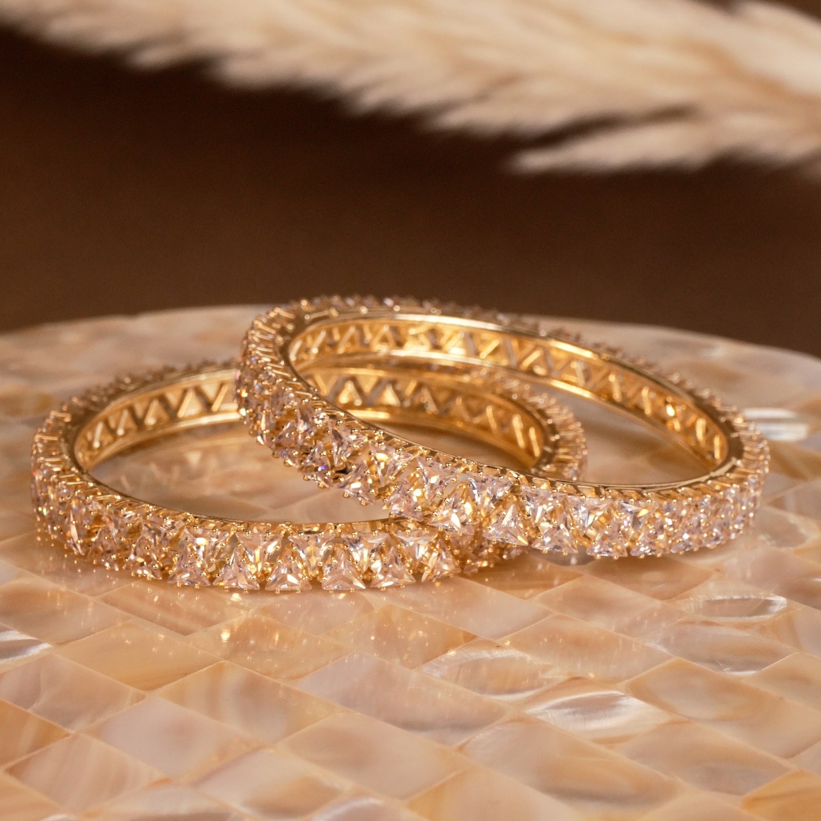 Elevate your style with Noor AD Bangle Kadas. These golden bangles feature intricate American diamond work for a touch of sparkle. Their double coated gold finish ensures long lasting shine, making them the perfect addition to any outfit. Show off your exceptional fashion sense with these beautifully designed bangles. (Noor means "light" or "sparkle" in Arabic.)