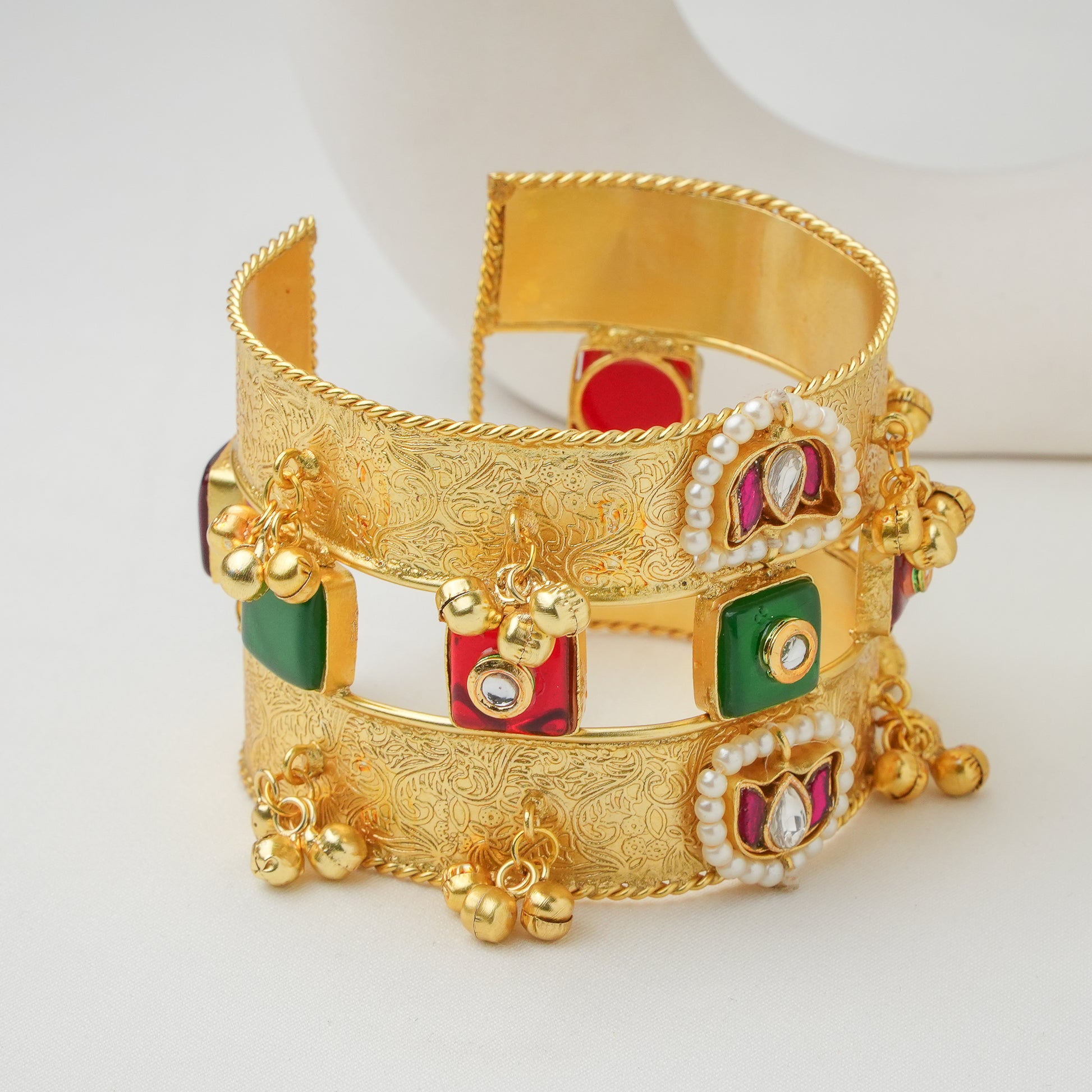This opulent cuff bracelet is handcrafted in polished brass and adorned with vibrant Kundan-style embellishments, faux pearls, and playful ghungroo charms. Intricate etching on the wide band adds a touch of antique grandeur, while the colorful enamel accents bring festive elegance to life.