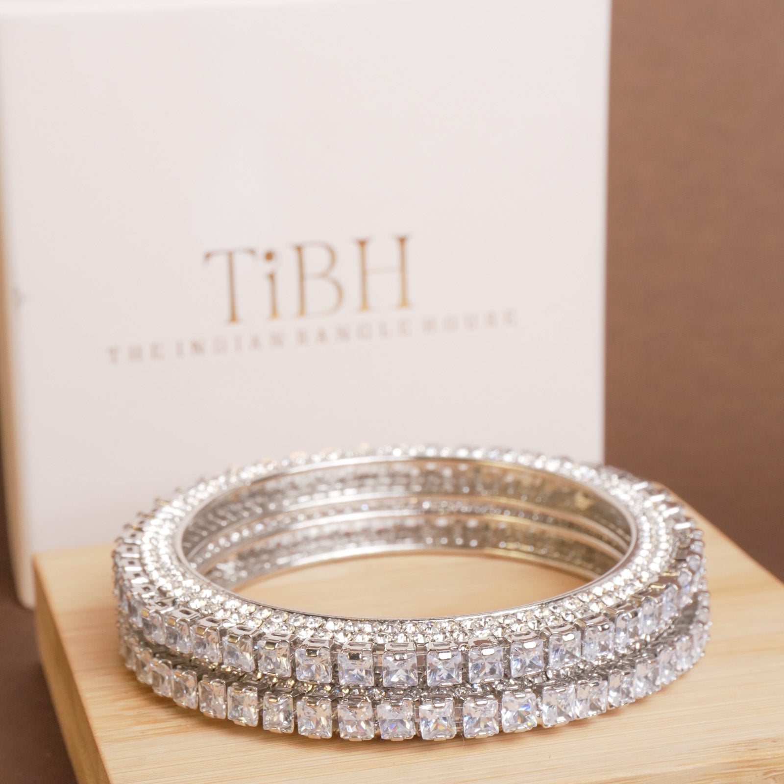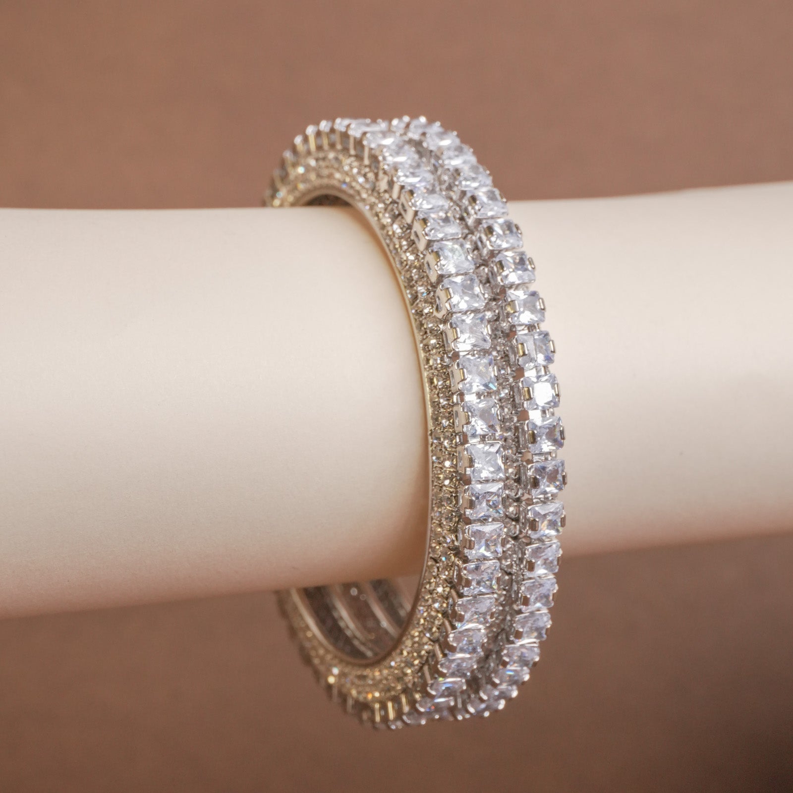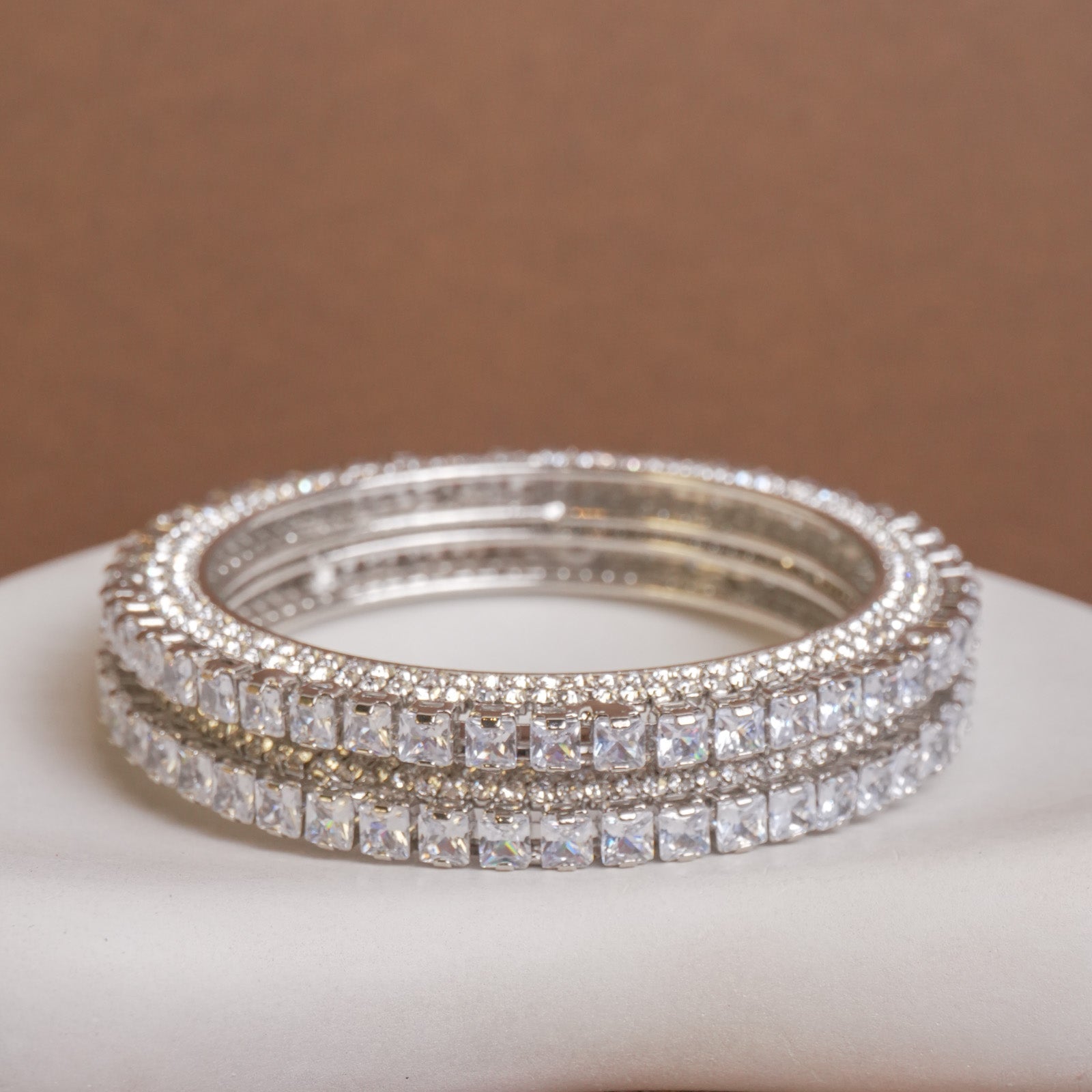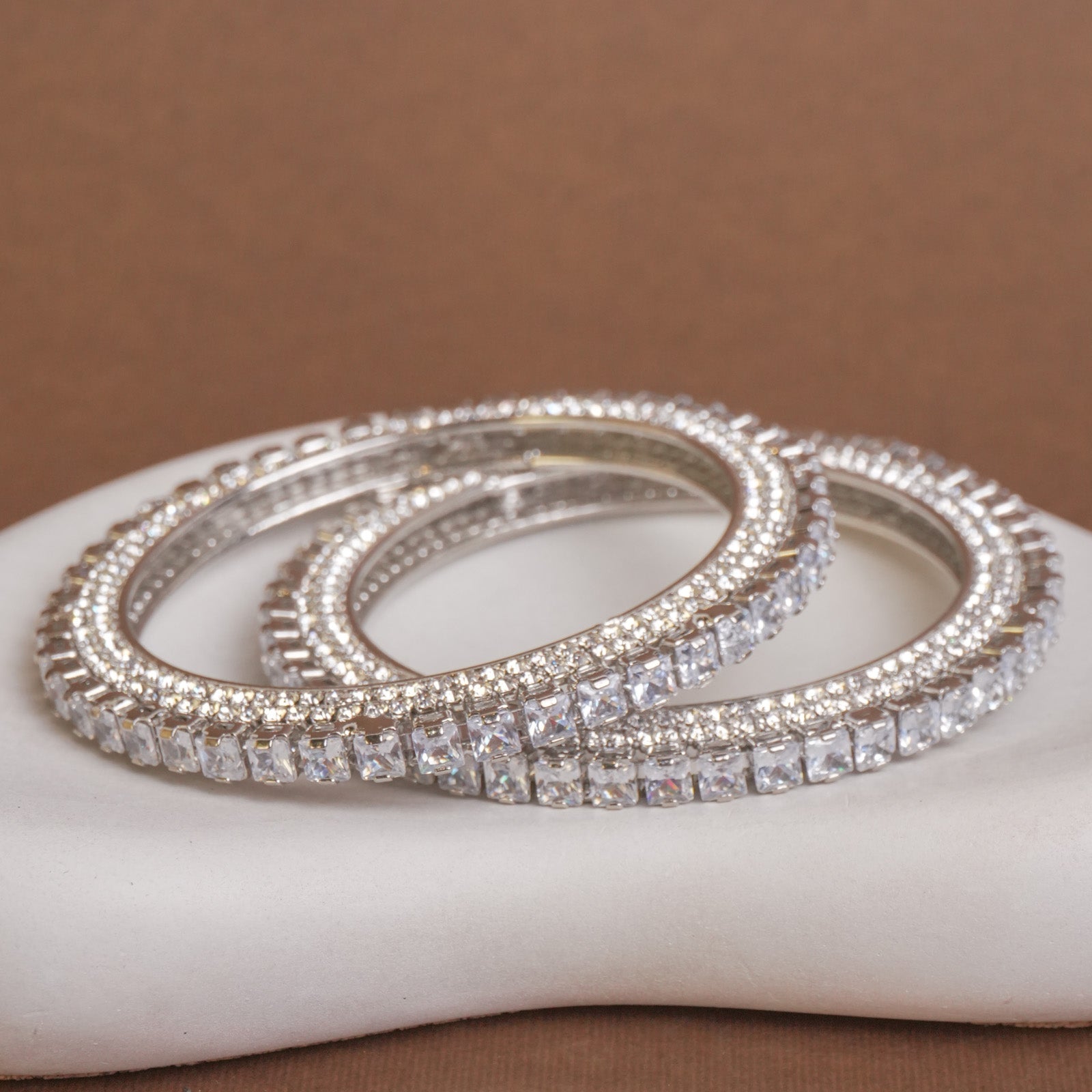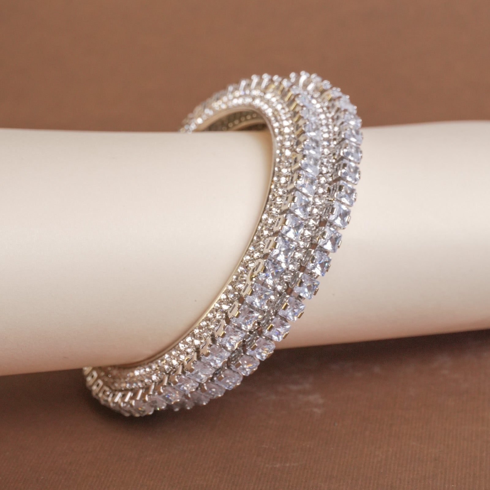 Add a touch of elegance to any outfit with our Silver American Diamond Kada Pair. Made of high-quality anti tarnish silver alloy and featuring beautiful American diamond embellishments, these kadas are perfect for any occasion. Complete your look and make a statement with these stunning and versatile sets.