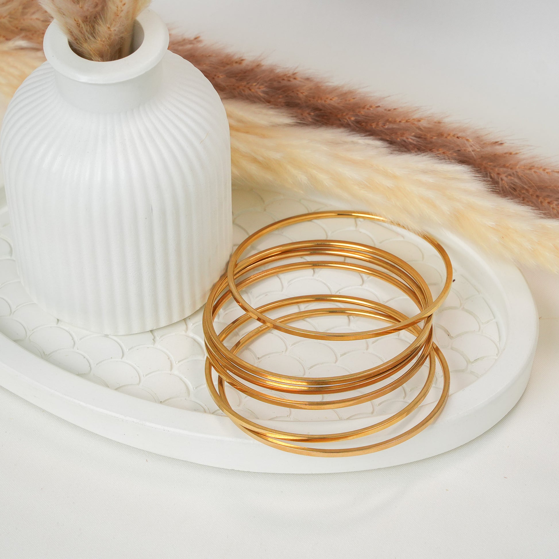 Add some elegant uniqueness to your style with this set of 6 stainless steel bangles. Each piece is gold plated and waterproof, making it both stylish and practical. The pendant and earrings add an extra touch of flair, while the skin-friendly material ensures comfort. A must-have addition to any jewelry collection.