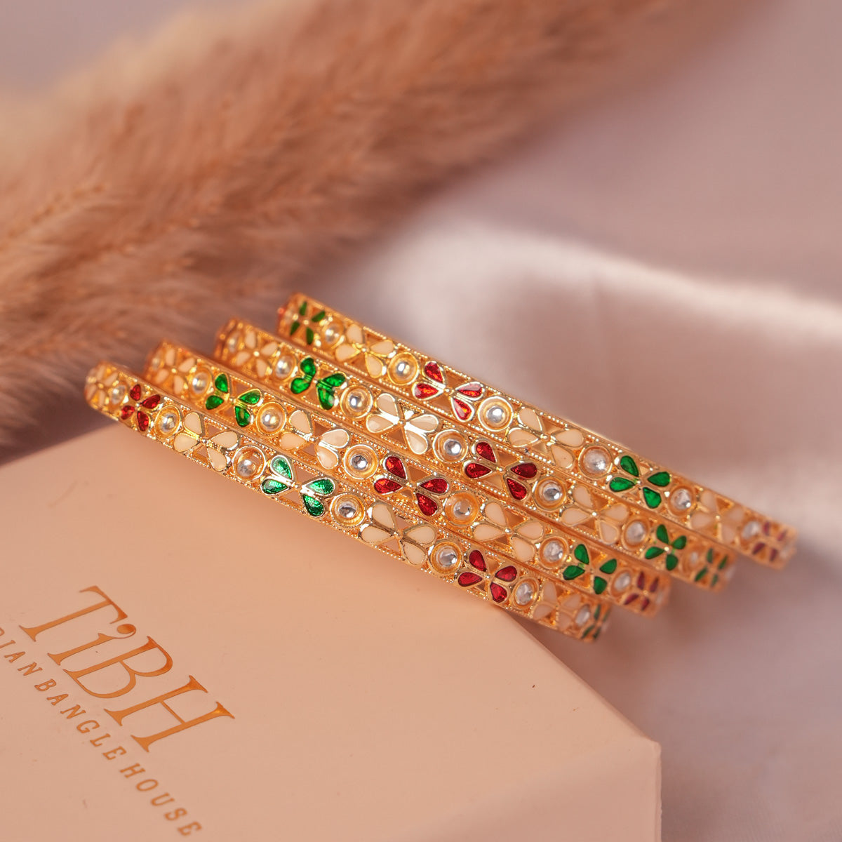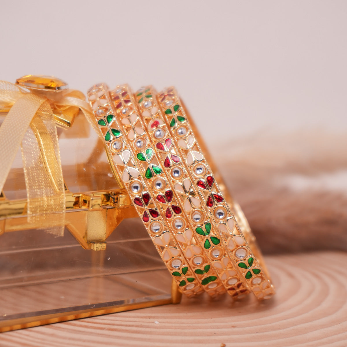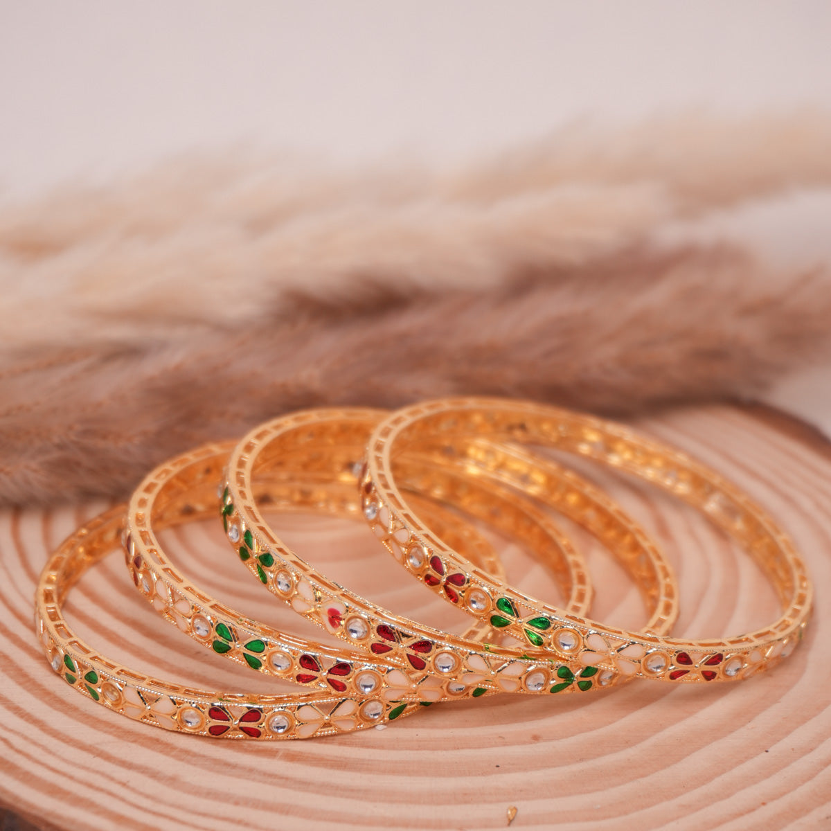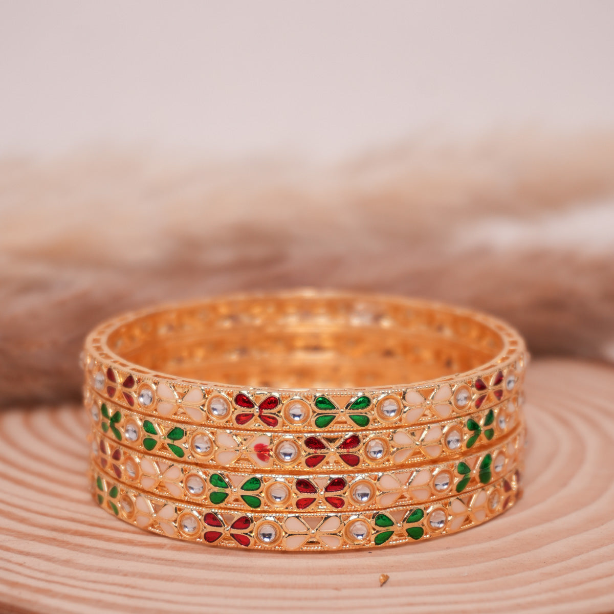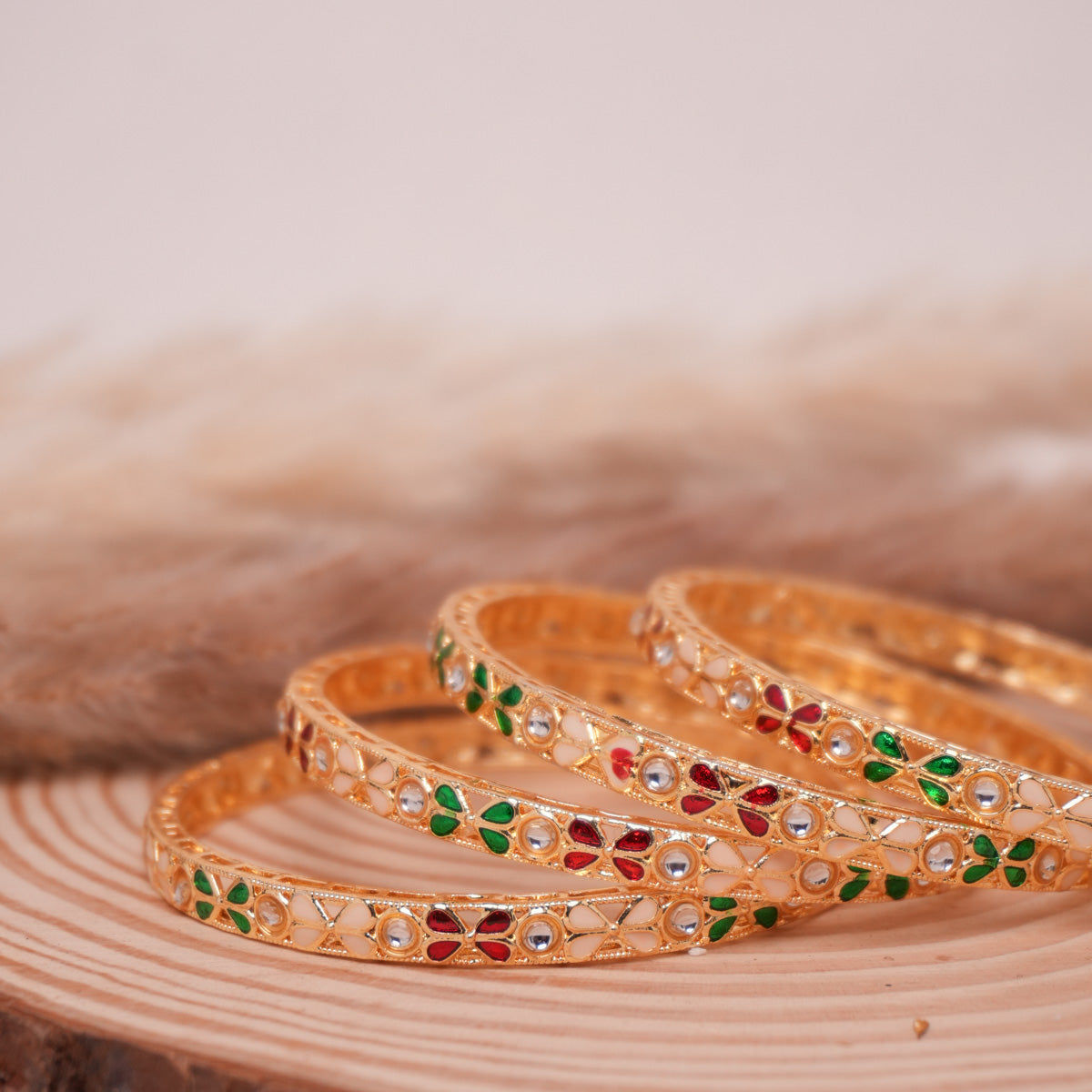 Elevate your ethnic and traditional outfits with our stunning Zaya Meenakari Bangles. These exquisite pieces showcase intricate handwork featuring traditional meenakari and kundan polki designs that capture attention at every gathering. Crafted from premium anti-tarnish brass alloy, these bangles maintain their luster and beauty even after multiple wears. Perfect for weddings, festivals, and special occasions when you want to make a statement with authentic artisanal jewelry.